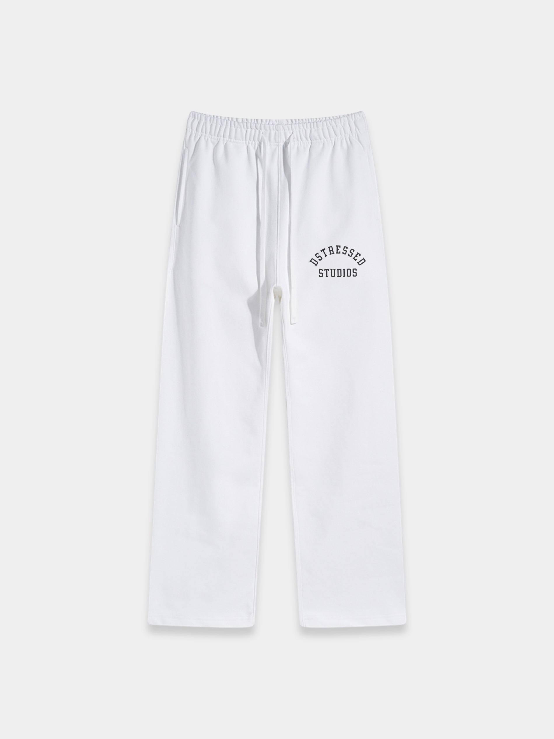 The Dstressed Studios Heavy Fleece Sweatpant is made from heavyweight 460gsm, cotton fleece. The signature graphic is screen-printed on the leg. Additional details include an encased elastic waistband with elongated drawstrings, side seam pockets, and wide straight ankle hems.