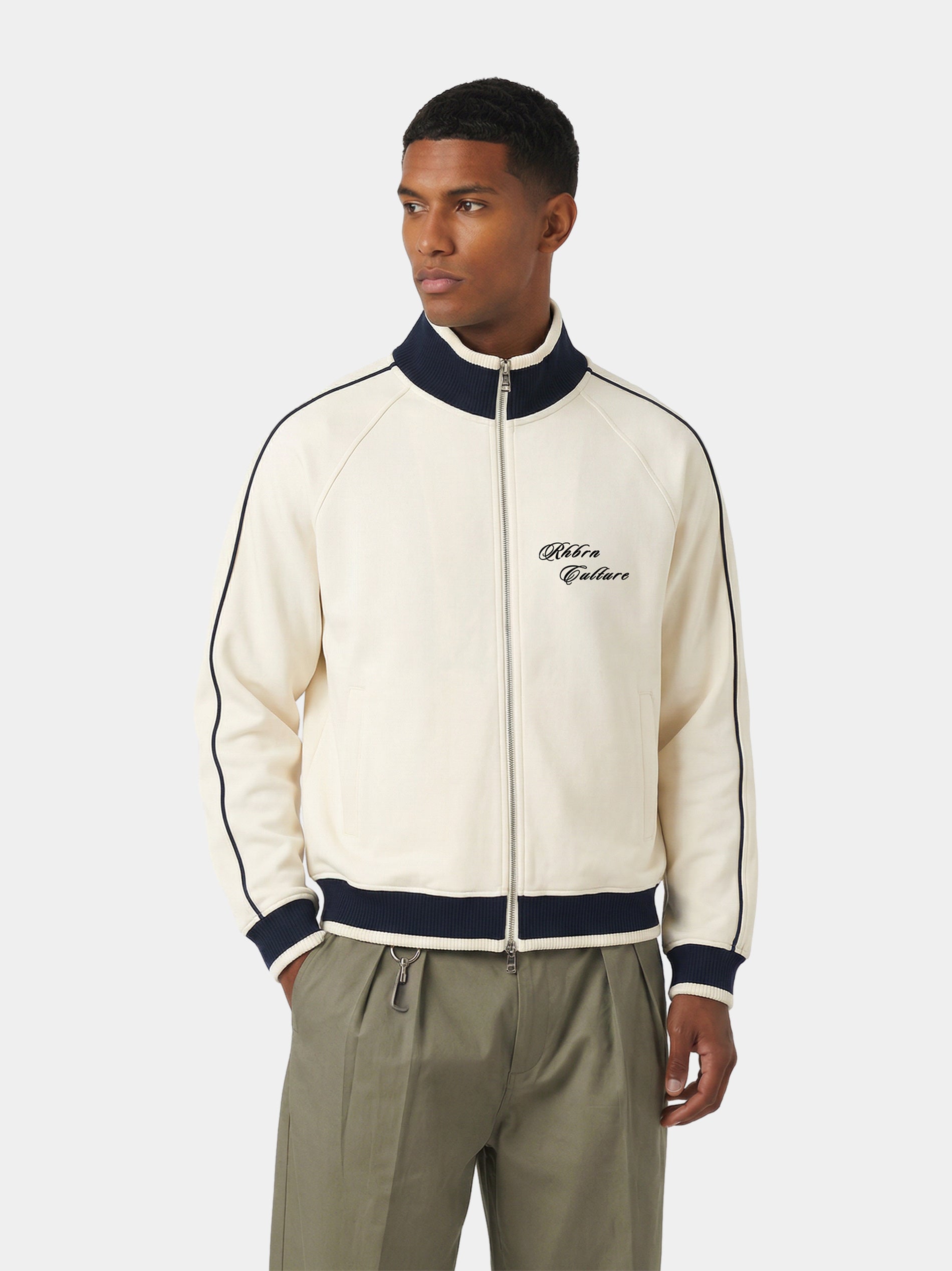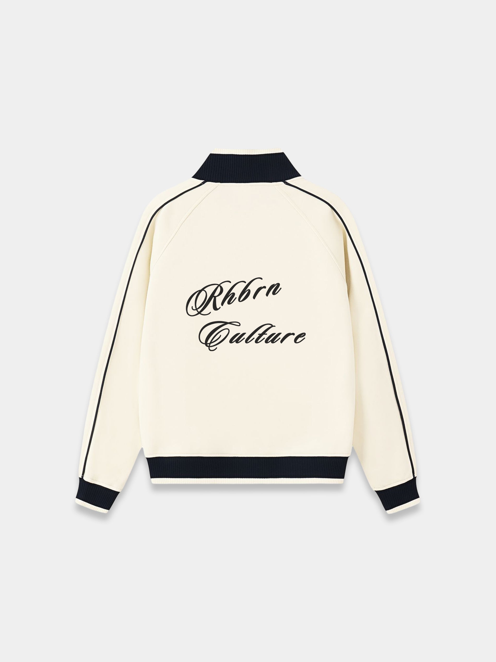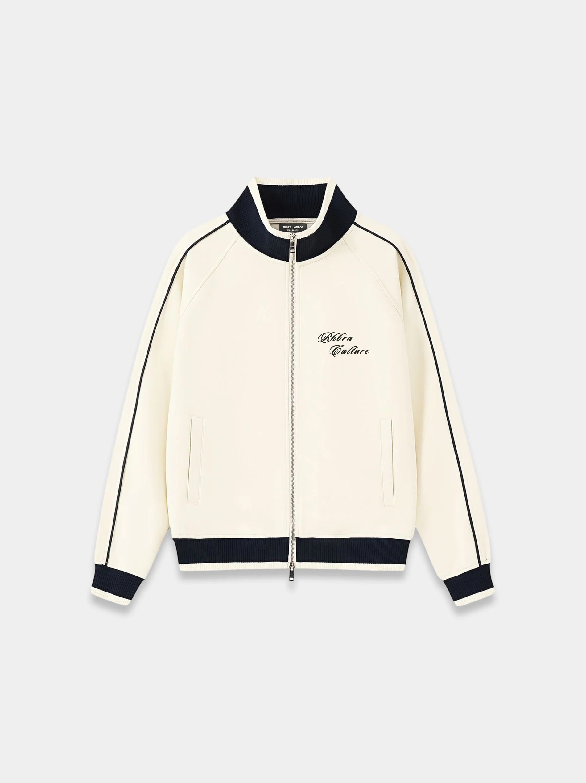Classic Rhbrn Full Zip Trackjacket is crafted from 380gsm. This contemporary jacket features striking color blocking on raglan sleeves and a modern stand collar design. Its classic silhouette is defined by a signature logo on the front. Rhbrn woven label stitched in the collar.